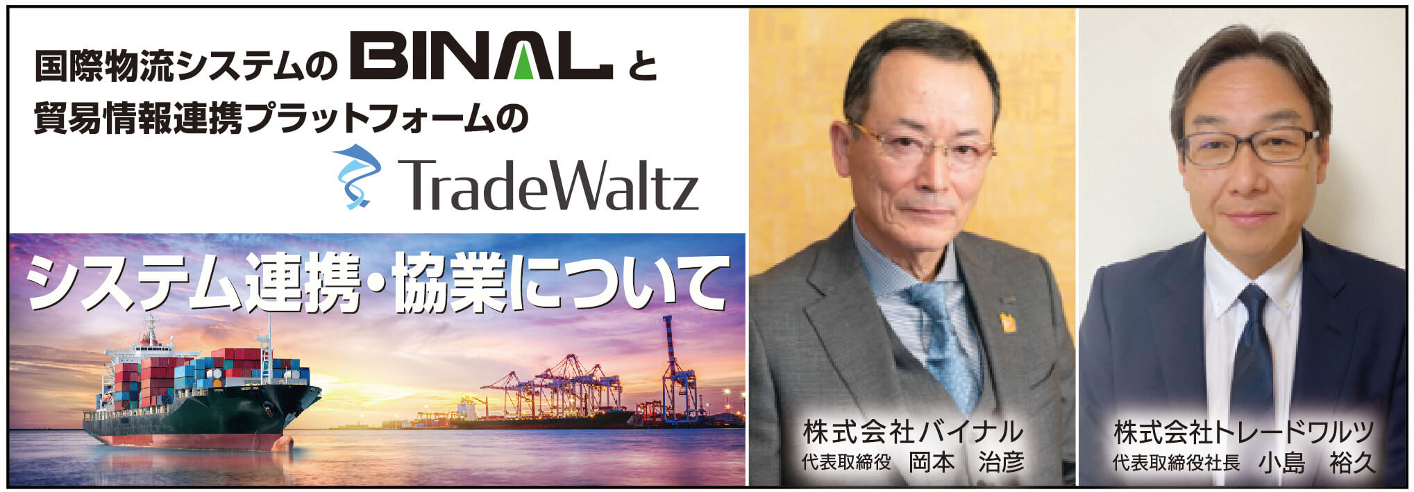 国際物流システムシェアNo.1「TOSS シリーズ」を開発・販売する株式会社バイナル(以下:バイナル)と貿易情報連携プラットフォーム「TradeWaltz」を運営する株式会社トレードワルツ(以下:トレードワルツ)は、本年10 月よりシステム間をAPI 連携し、一部ユーザーの書類連携業務から完全電子化機能をトライアル利用していくことを発表致します。